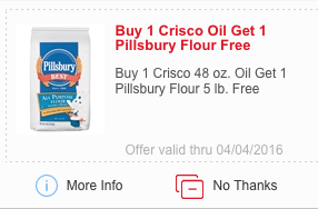 We have a nice mPerk offer on Crisco Oil and Pillsbury Flour to clip! Buy 1 Crisco 48 oz oil, Get 1 Pillsbury Flour 5 lb FREE