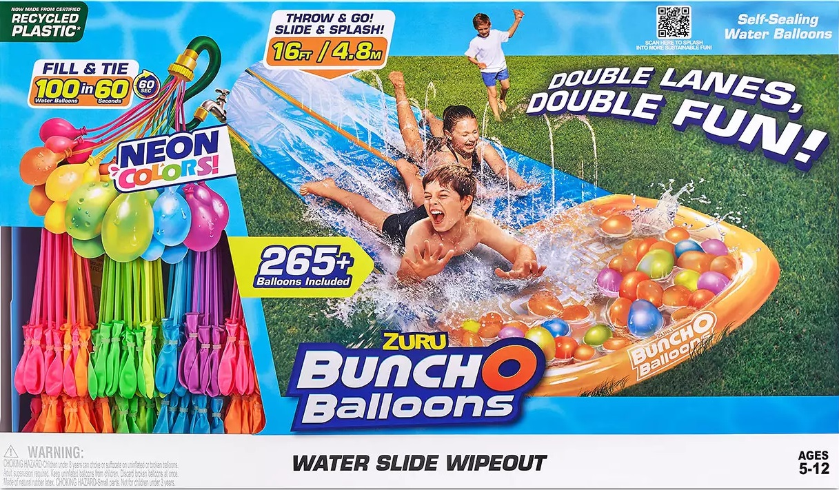 Slide into summer with this 2-lane Zuru Water Slide Wipeout! Combine the thrill of sliding on water and splashing into hundreds of self-sealing, fast-filling water balloons to enjoy the perfect refreshing summer game! Fill and Tie 100 water balloons in less than 60 seconds, to save time and unleash summer! Simply attach the stem to a hose, fill them big & shake to make hundreds of Water Balloons in seconds. Yup, it really is that easy! Bunch O Balloons patented O-ring technology means there is no tying necessary. These innovative Water Balloons Self-Seal, leaving you more time to play! Summer’s too short so make sure you spend it trying out this brilliant water fight, water slide fun combination! Get it for only $14.97!